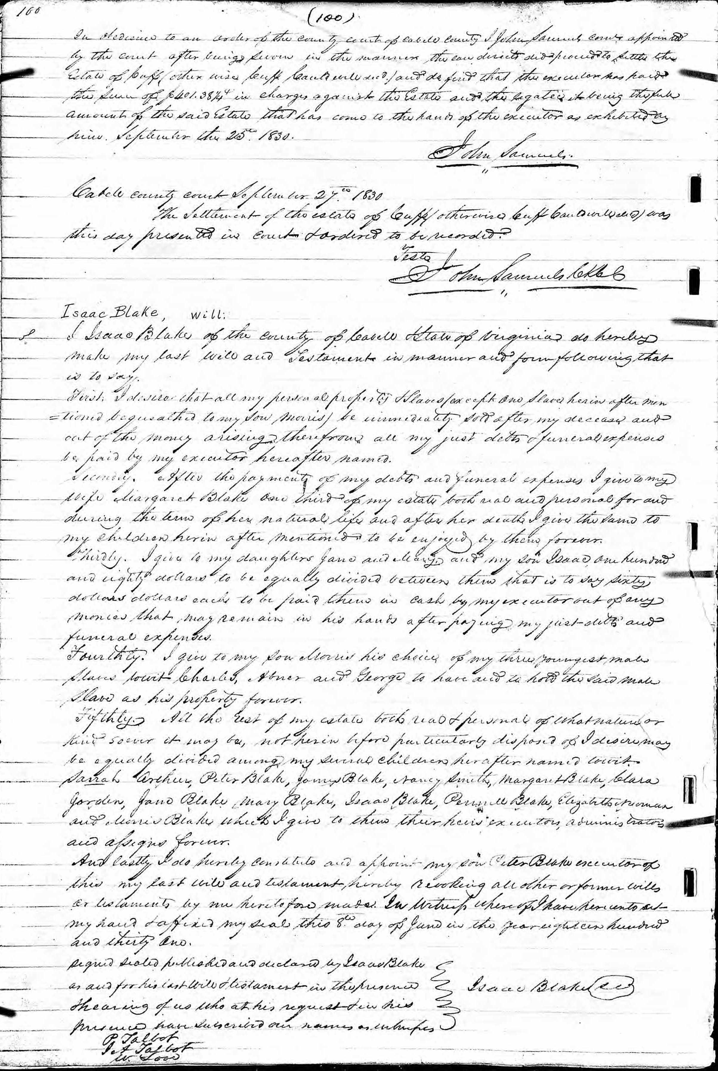 - October 17, 1834 – Margaret Blake, widow and relicit of Isaac Blake, sells to Peter Blake a tract in Cabell County on Mud River.