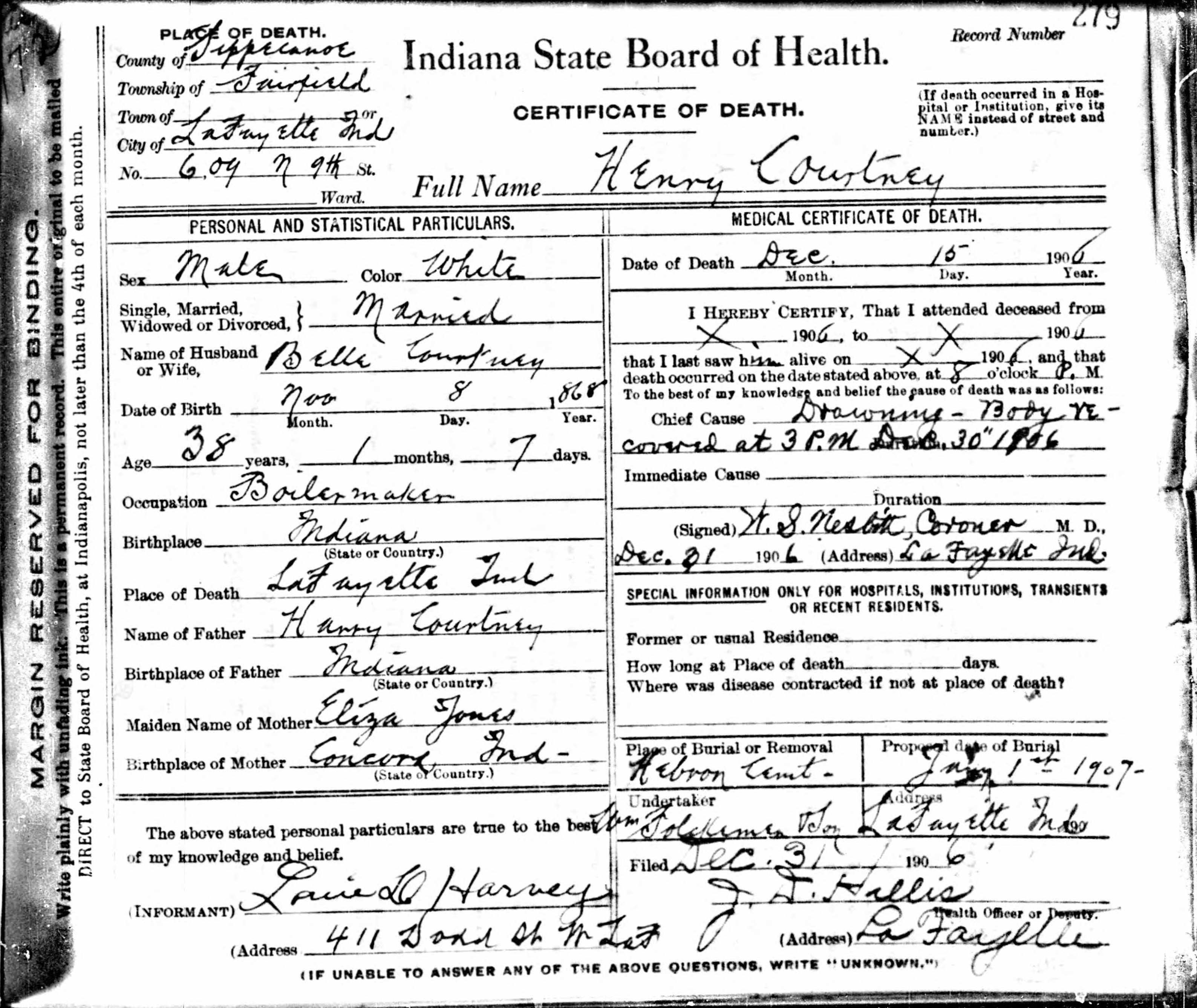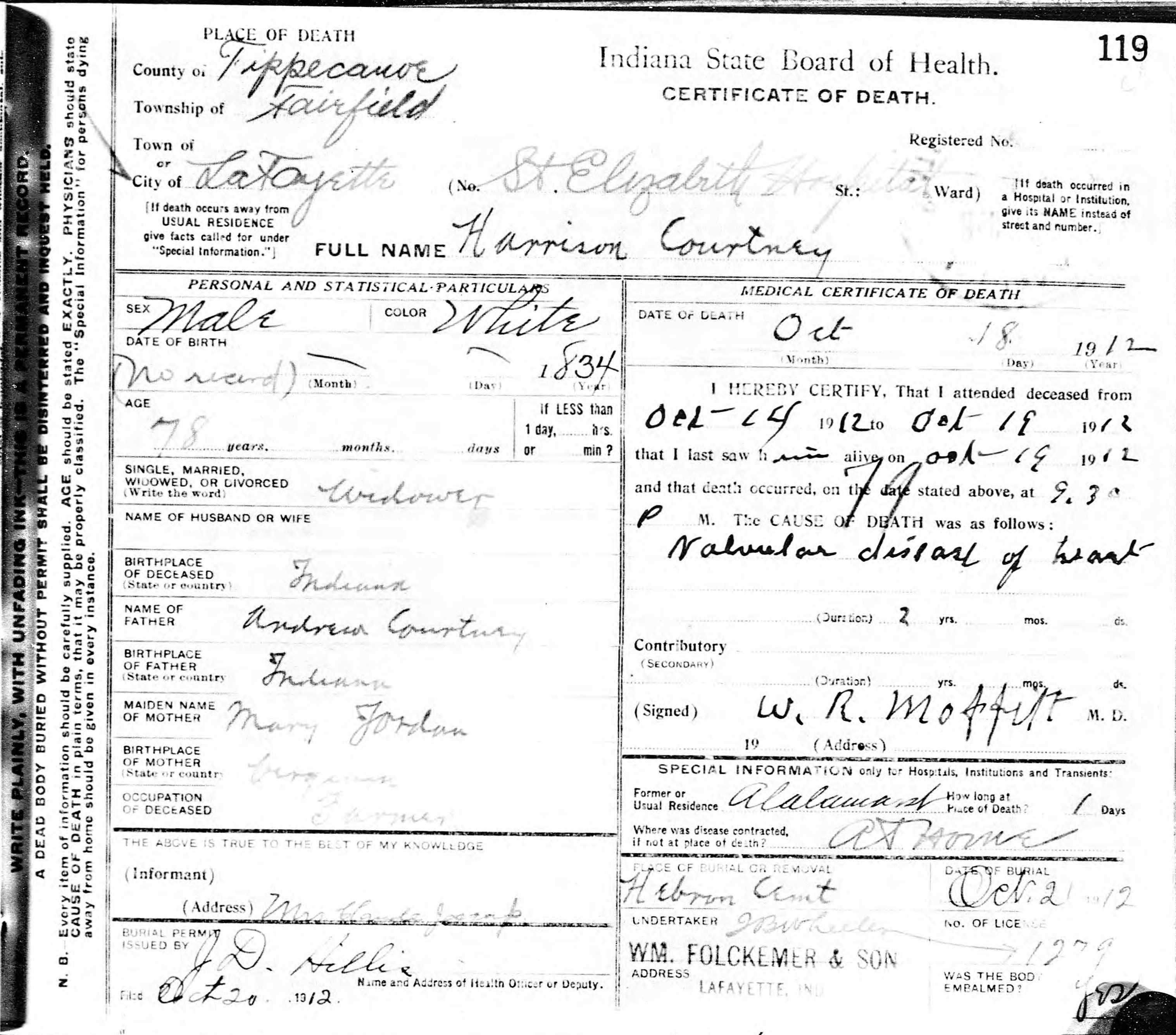 3. Harrison Courtney was born in November 1834 in Tippecanoe County, Indiana, and died October 18, 1912 in Lafayette, Tippecanoe County, Indiana. He is buried in Hebron Cemetery, Tippecanoe County, Indiana. After his parents’ deaths, Harrison lived temporarily with his Uncle James Jordan. Harrison married Louisa “Eliza” Jones on August 3, 1868 in Tippecanoe County, Indiana.