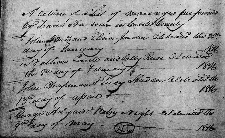 Eleanor Jordan, daughter of William Jordan and Blanche Fullerton,[1] was born circa 1794 in Greenbrier County, (West) Virginia. When she was around five years old, her parents moved their young family west to the Mud River area of Cabell County. There she married John Burns, the son of Peter Burns and Jane Miller, on January 25, 1816. John, a veteran of the War of 1812, was born on May 12, 1789, also in Greenbrier County.