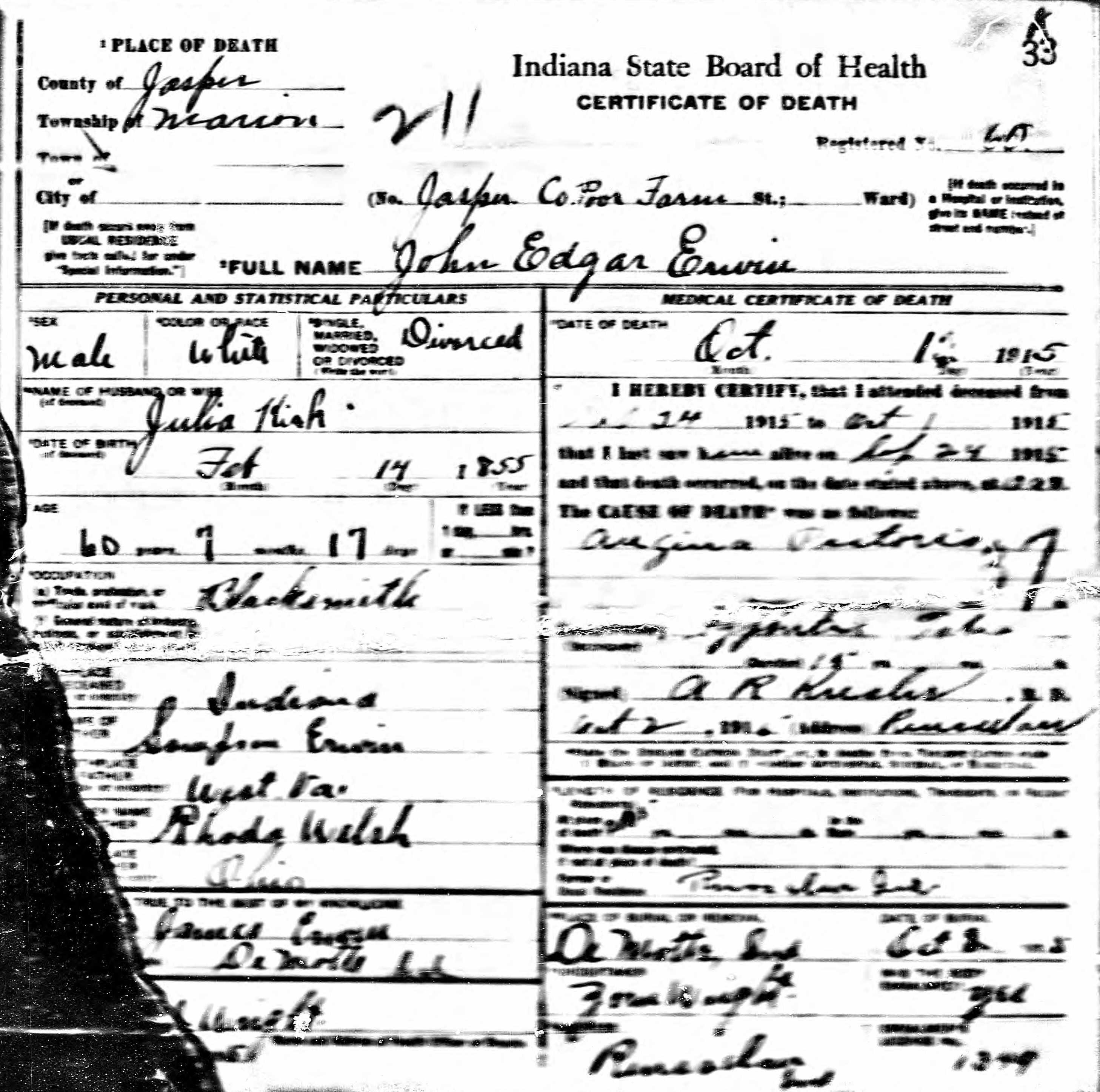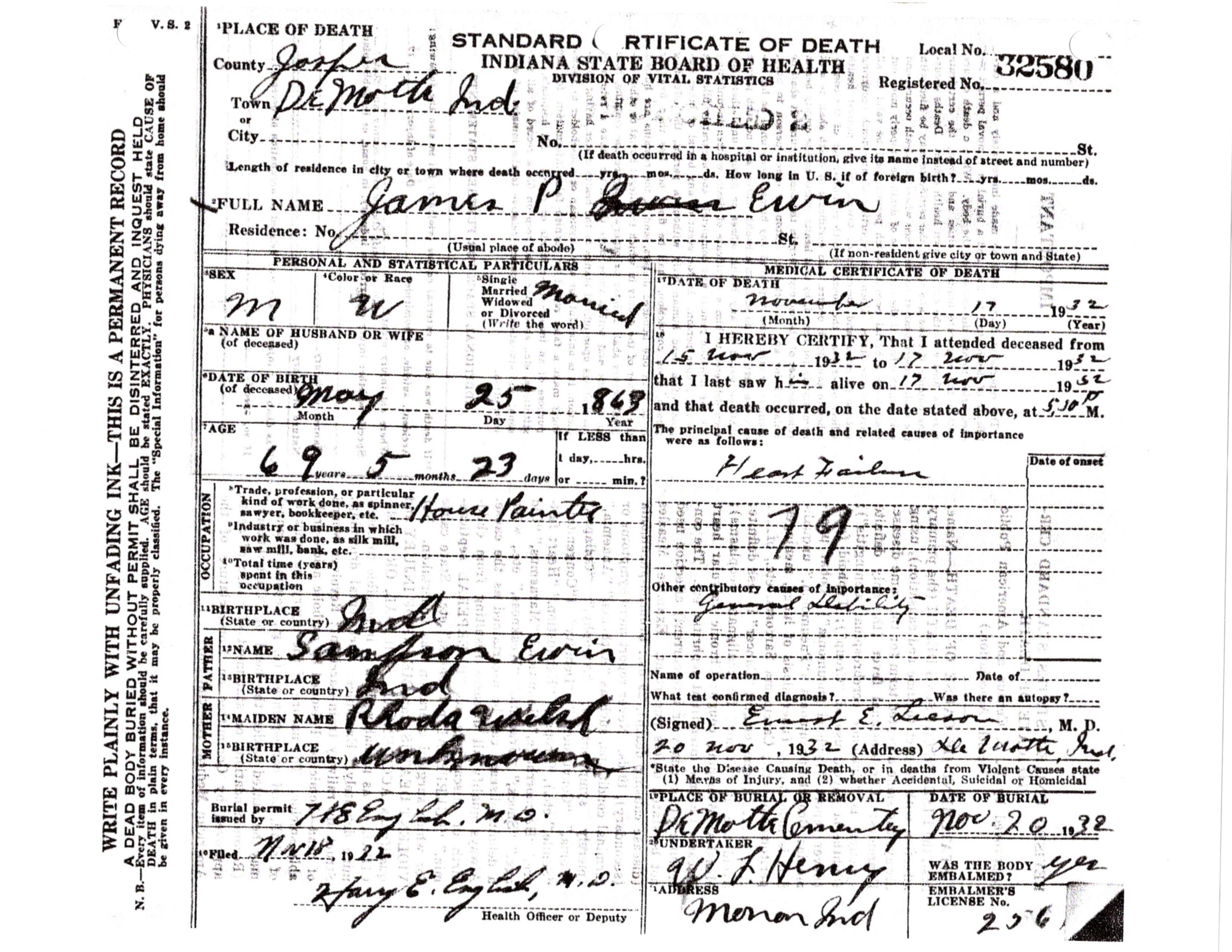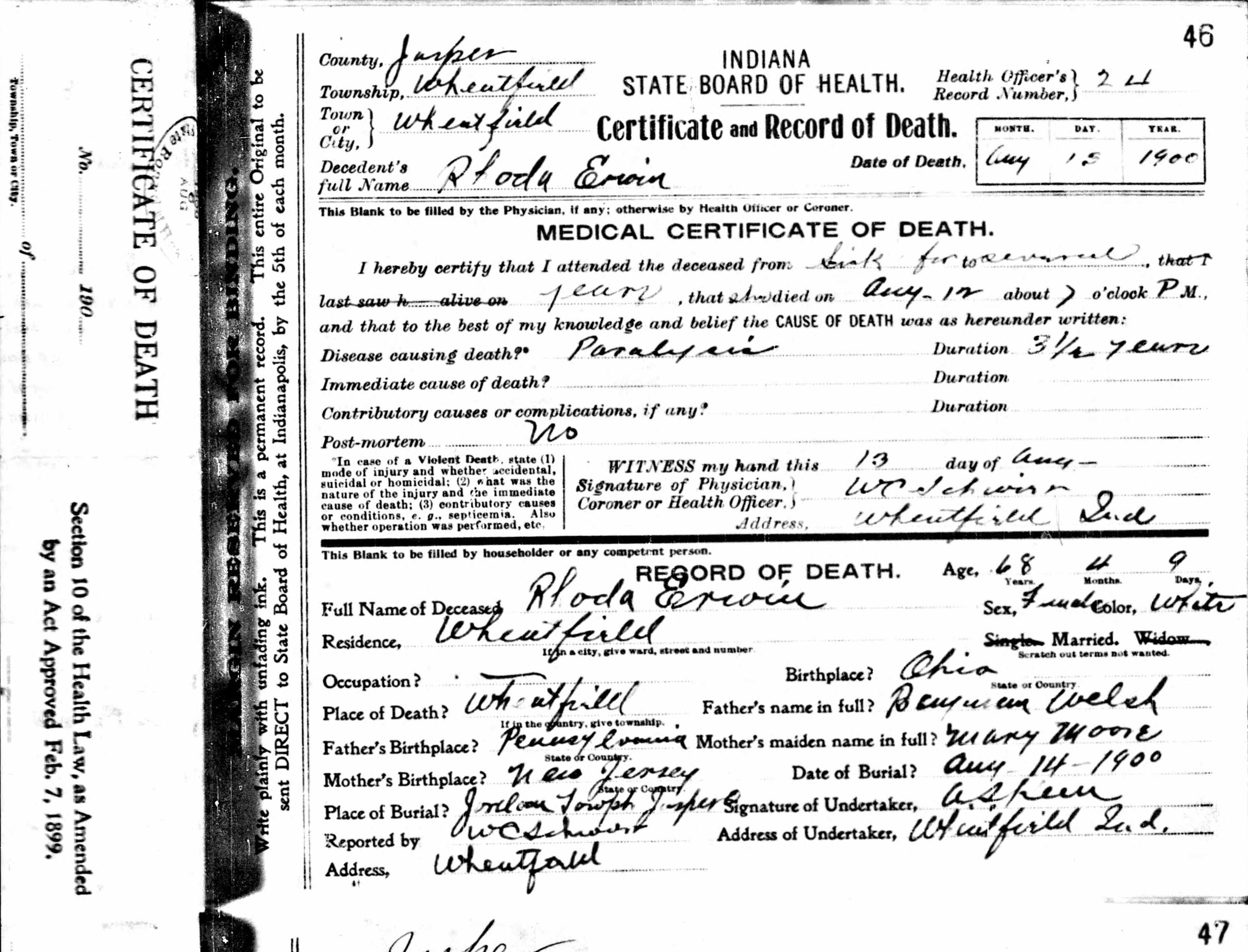 1. Sampson Erwin was born in September 1827 in (West) Virginia, and died on April 2, 1901 in Wheatfield Township, Jasper County, Indiana. He married Rhoda Welsh, daughter of Mary Welsh, on January 22, 1850 in Jordan Township, Jasper County, Indiana. Rhoda was born on April 3, 1832 in Ohio and died on August 12, 1900 in Wheatfield Township, Jasper County, Indiana. Both Both Sampson and Rhoda are buried in Welsh Cemetery, Jasper County, Indiana.